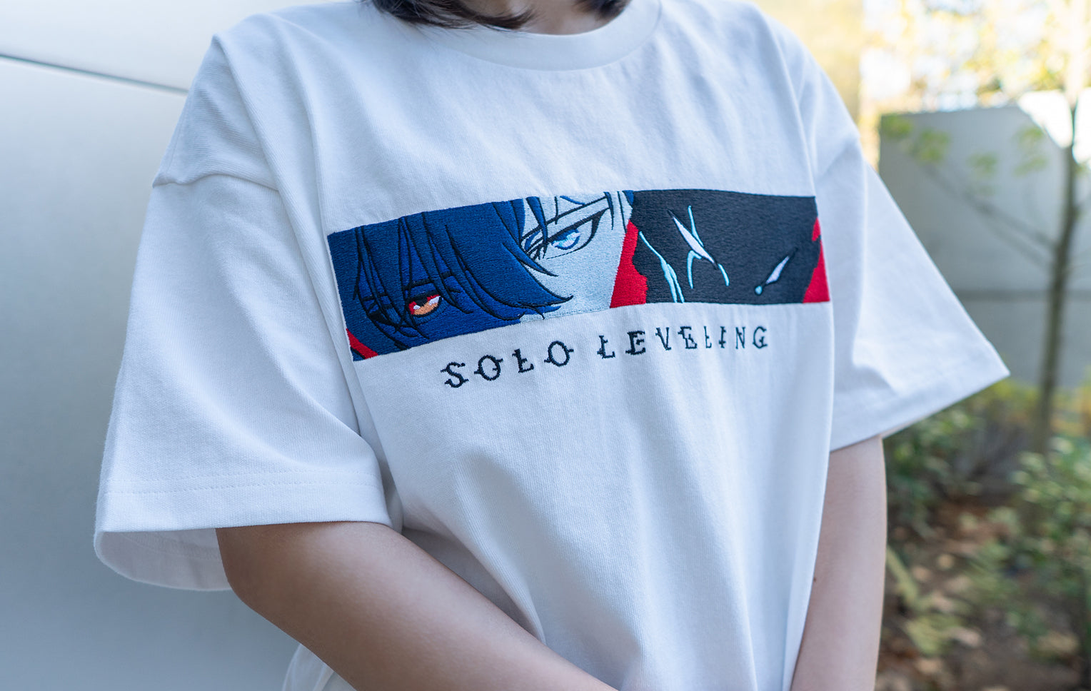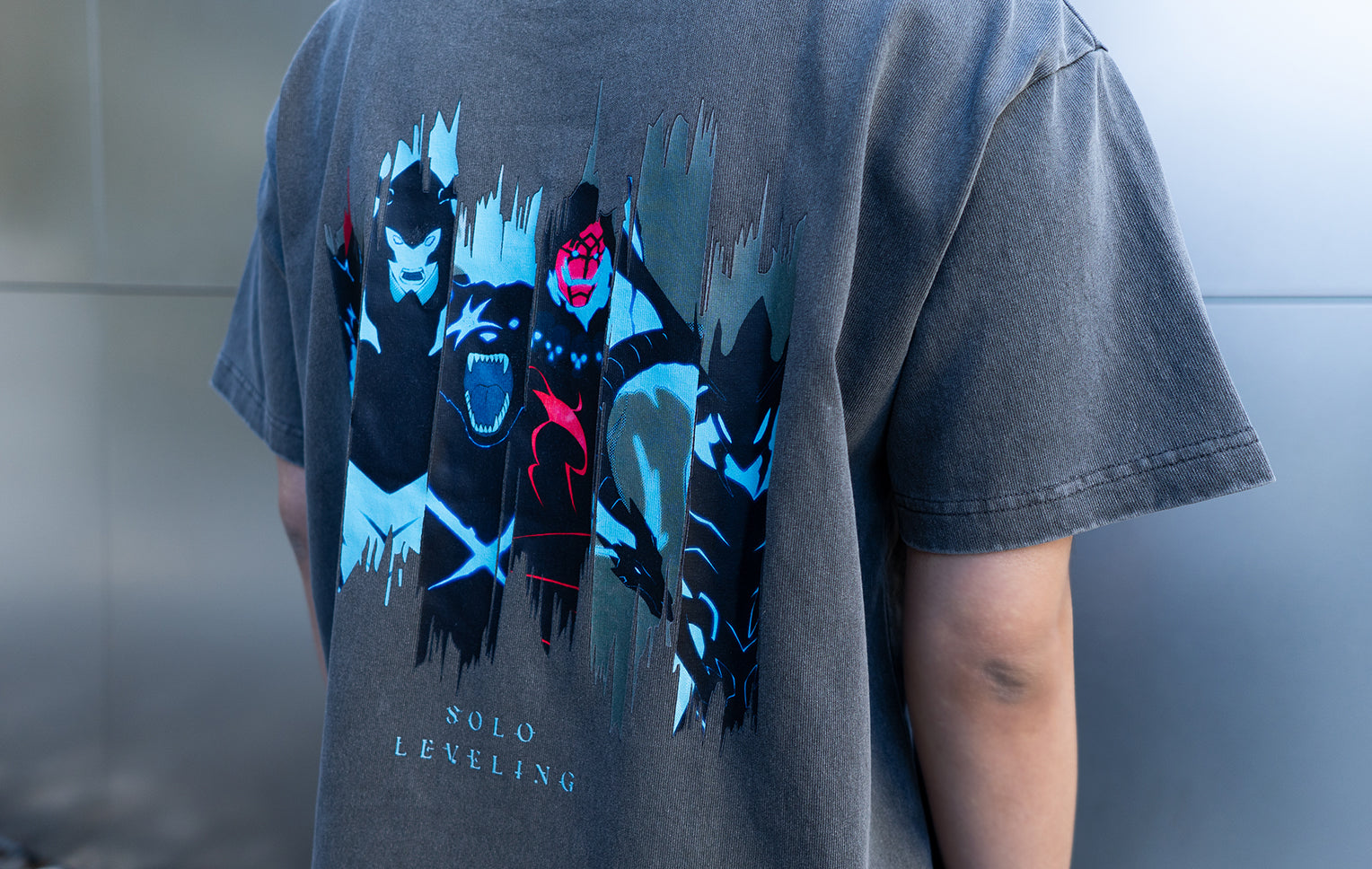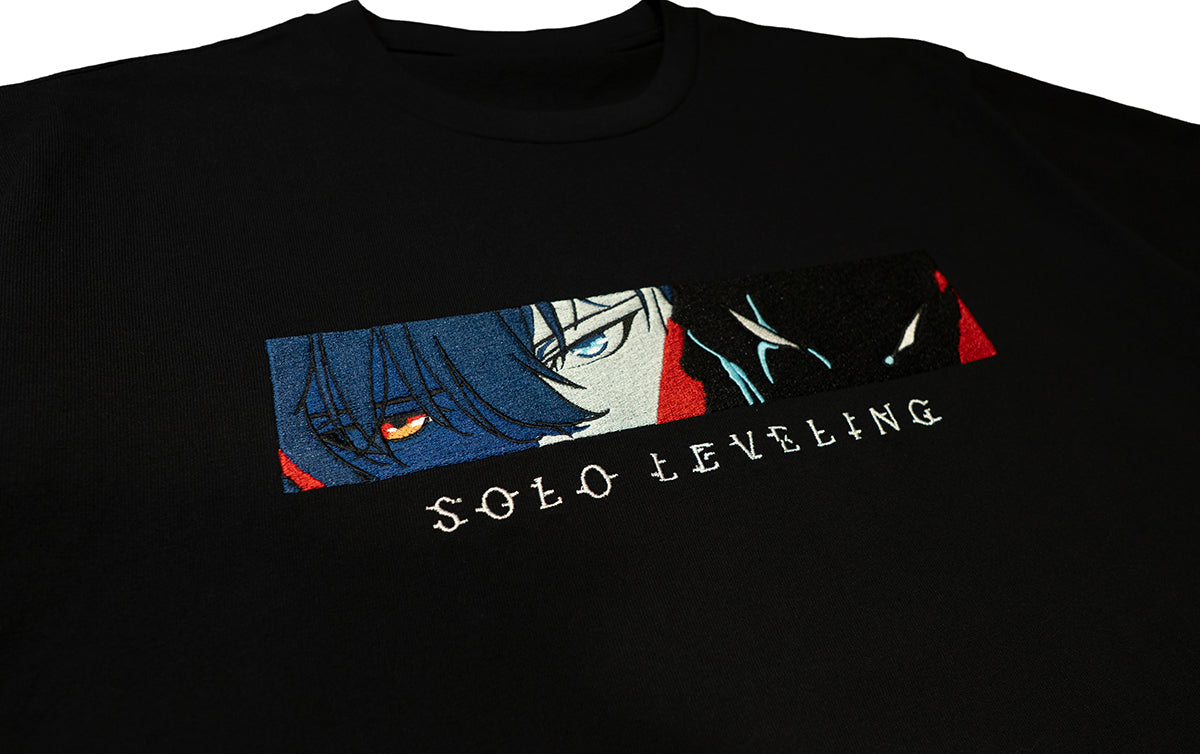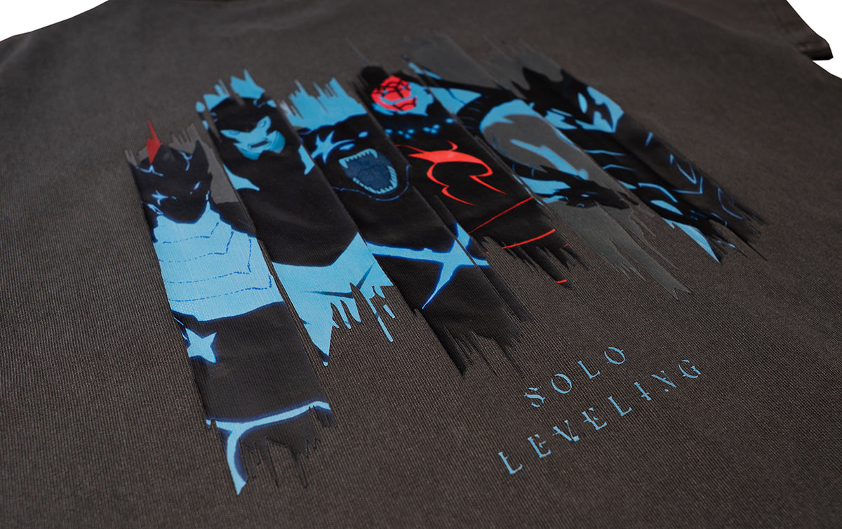 Boldly expressing Sung Jin-Woo's awakening and the overwhelming presence of the Shadow Legion through graphics and texture. We've translated the work's tension, the flickering shadows, and the contrast between light and darkness into the design, crafting garments where the story of “Solo Leveling” Season 2 breathes within everyday style.