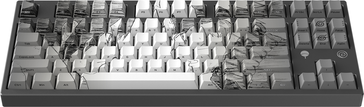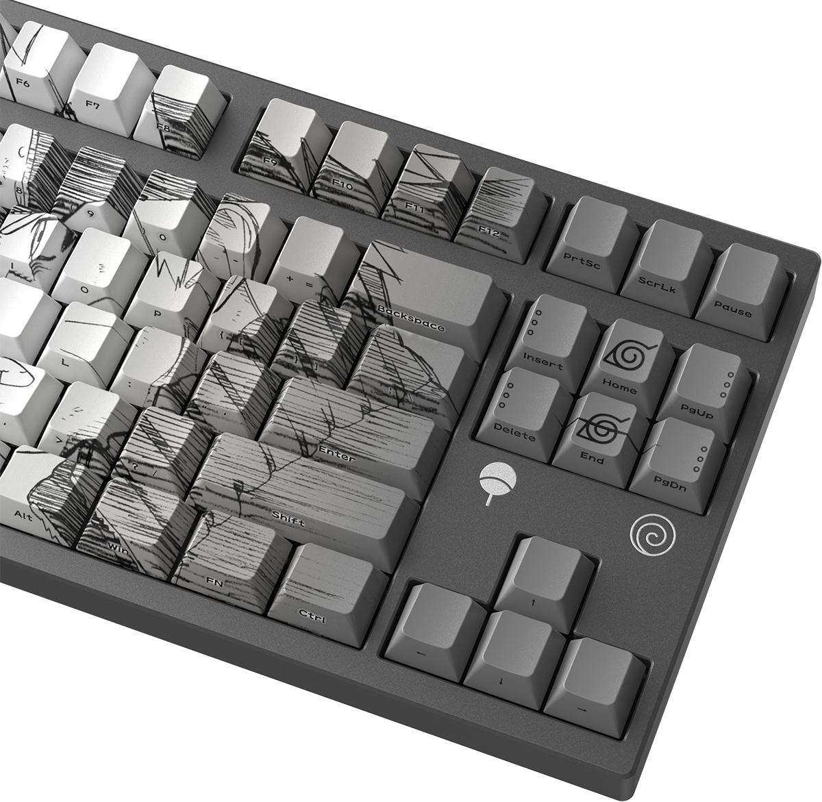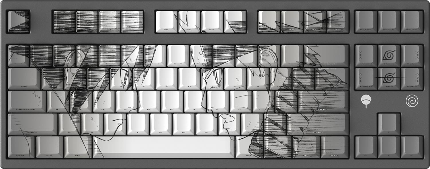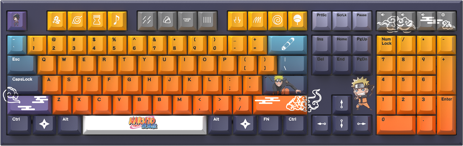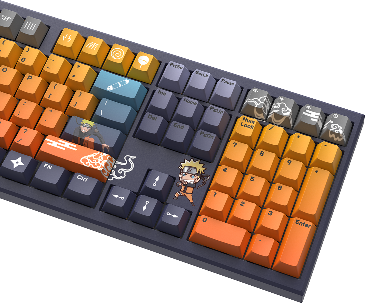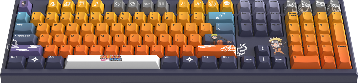 ナルトのイメージカラーであるオレンジを基調に、「木ノ葉マーク」「手裏剣」などのアイコンをキーキャップに配置。